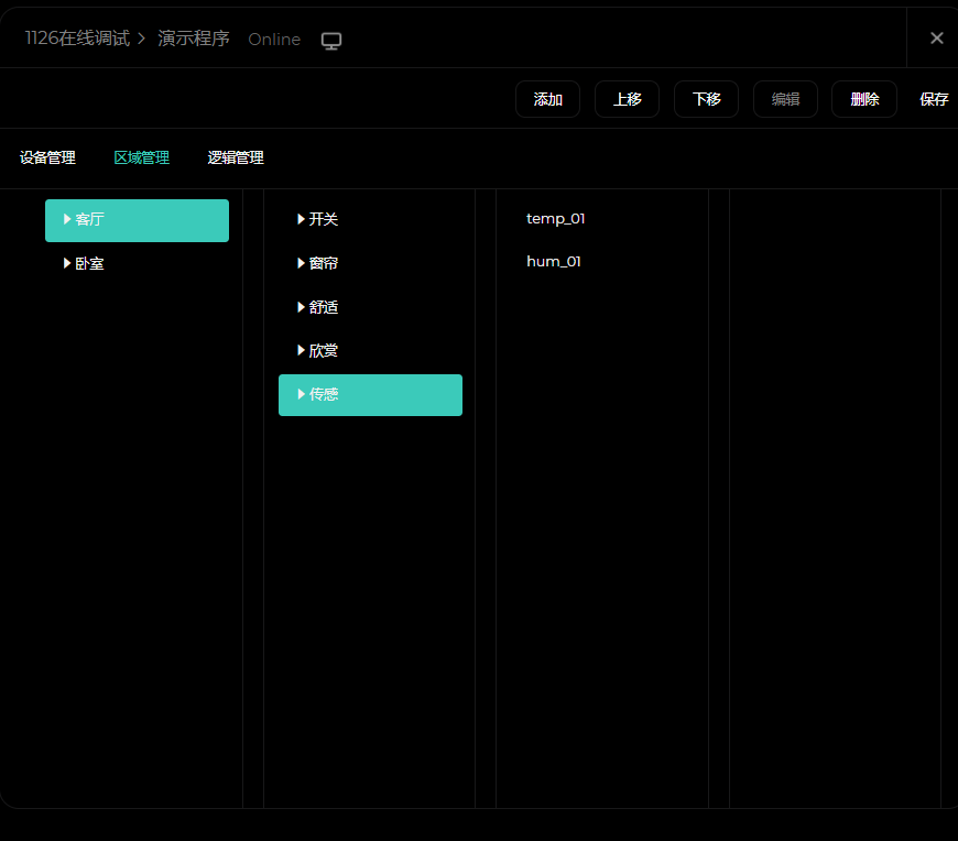 1)进入了程序员里面,点击rs485-1 或者rs485-2,点击添加,选择传感器,点击精选畅通(3),选择屏显温湿度传感器,点击“+”,填好参数,选择好区域,点击保存。